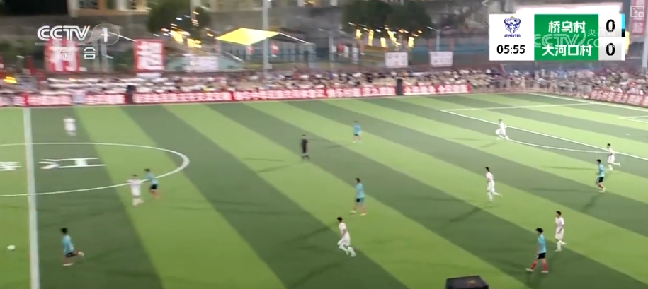 这是“村超”重启后第一天比赛的最后一场,由桥乌村队对战大河口村队,是“村超”村级联赛20强的比赛。现在场上激战正酣,两支球队势均力敌。值得一提的是这个大河口村队,它是这次榕江特大洪灾中受损最为严重的村之一。因为它是码头,地势低洼,所以是洪水冲击榕江县城的第一站,也是灾后重建的攻坚难点。