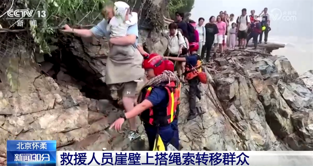 北京怀柔:救援人员崖壁上搭绳索转移群众