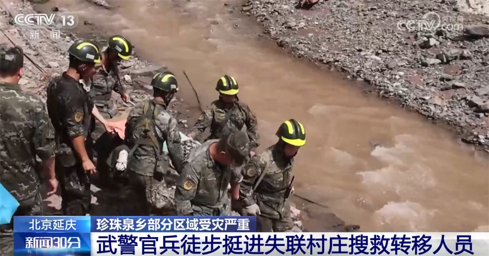 北京延庆:武警官兵徒步挺进失联村庄搜救转移人员