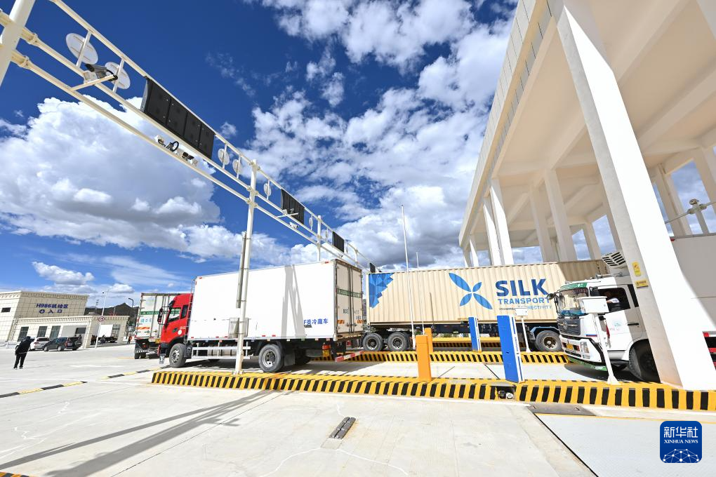 走进日喀则国际陆地港,一辆辆运载日用百货的大型卡车驶入查验场,将“中国造”源源不断送往尼泊尔等南亚国家;