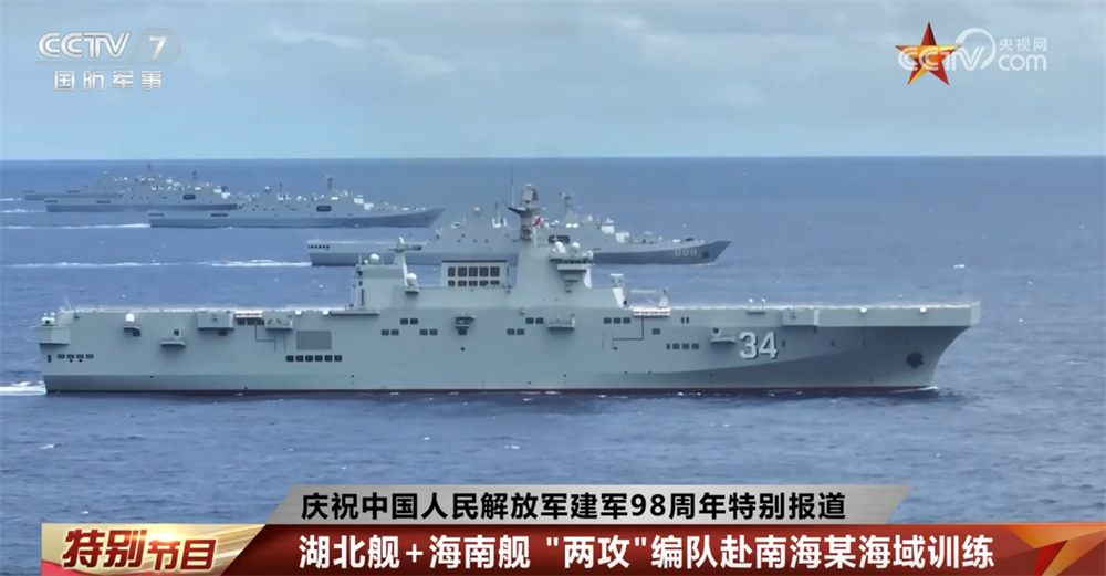 近日,海军湖北舰、海南舰组成舰艇编队赴南海某海域开展训练。湖北舰、海南舰都是我国自主研制的075型两栖攻击舰,最大排水量超过了4万吨。