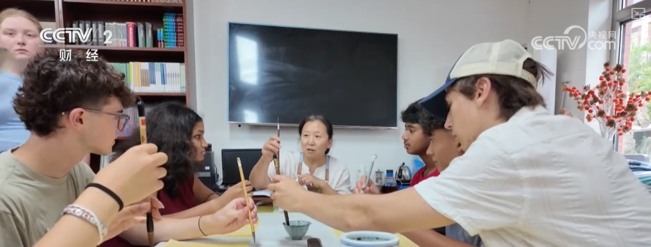在北京的一所大学里,一个来自美国的研学团正在跟老师学习写毛笔字。