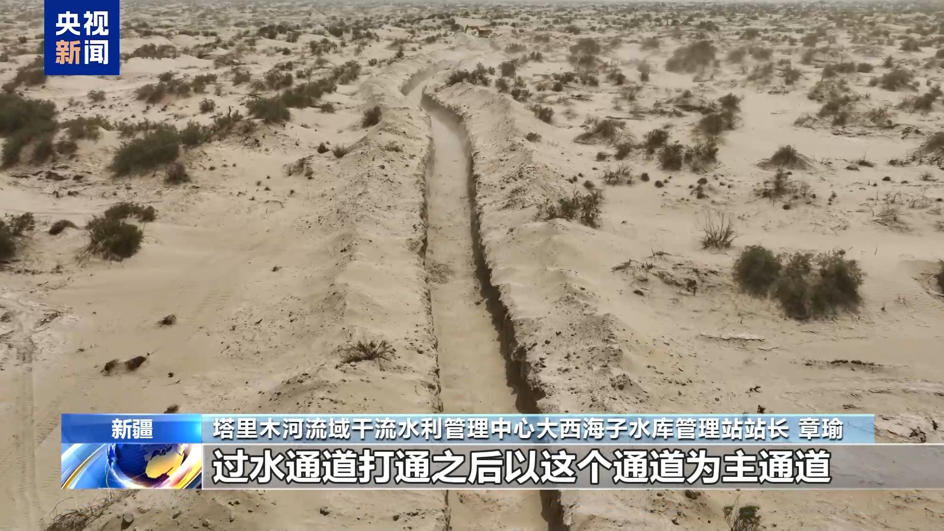 塔里木河流域干流水利管理中心大西海子水库管理站站长章瑜介绍,这是他们今年新开挖的一个过水通道,打通之后以这个通道为主通道,每间隔一公里到两公里开挖它的毛细通道。这样就横向地扩大了它的受水面积,有效地保证这一片区域的植被用水。