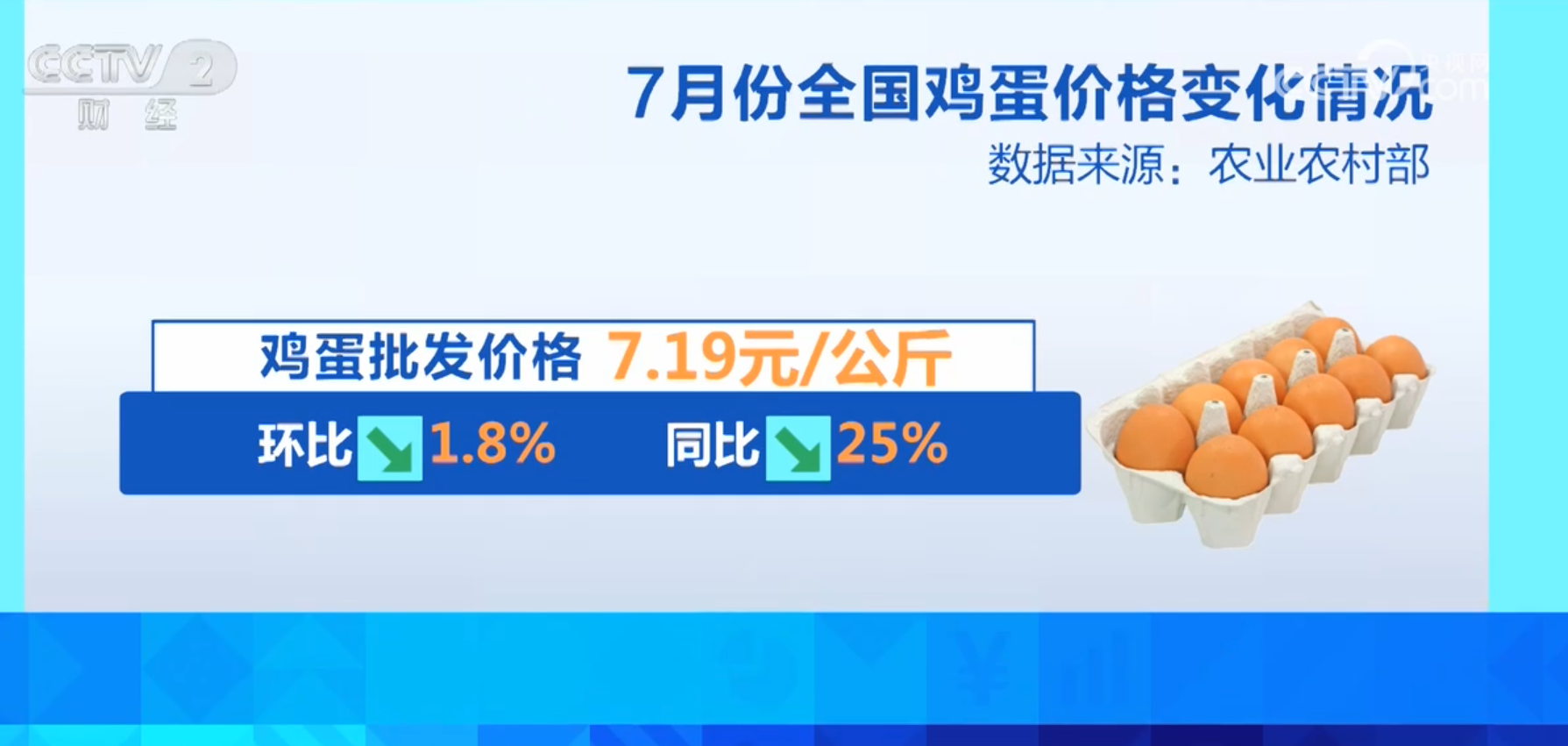 农业农村部数据显示,7月份全国鸡蛋批发价为每公斤7.19元,环比下降1.8%,同比下降25%。