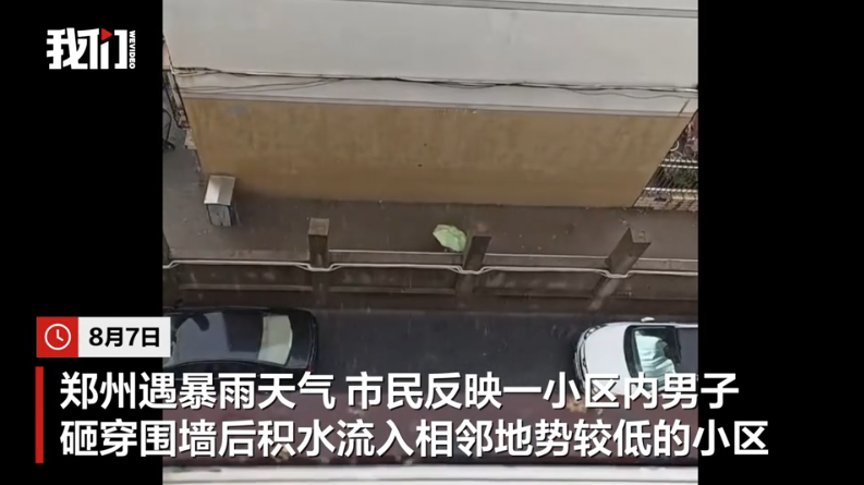 ·郑州暴雨一男子砸墙泄流隔壁小区,社区:缺口已堵,正协调维修。