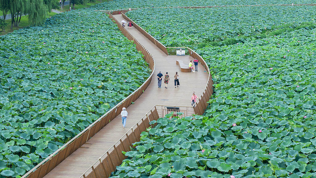 2025年8月8日,江苏南京玄武湖公园内的荷花绽放,荷香浮动,蜿蜒的赏荷栈道穿行于碧叶粉荷之间,吸引游客前来赏荷游玩。
