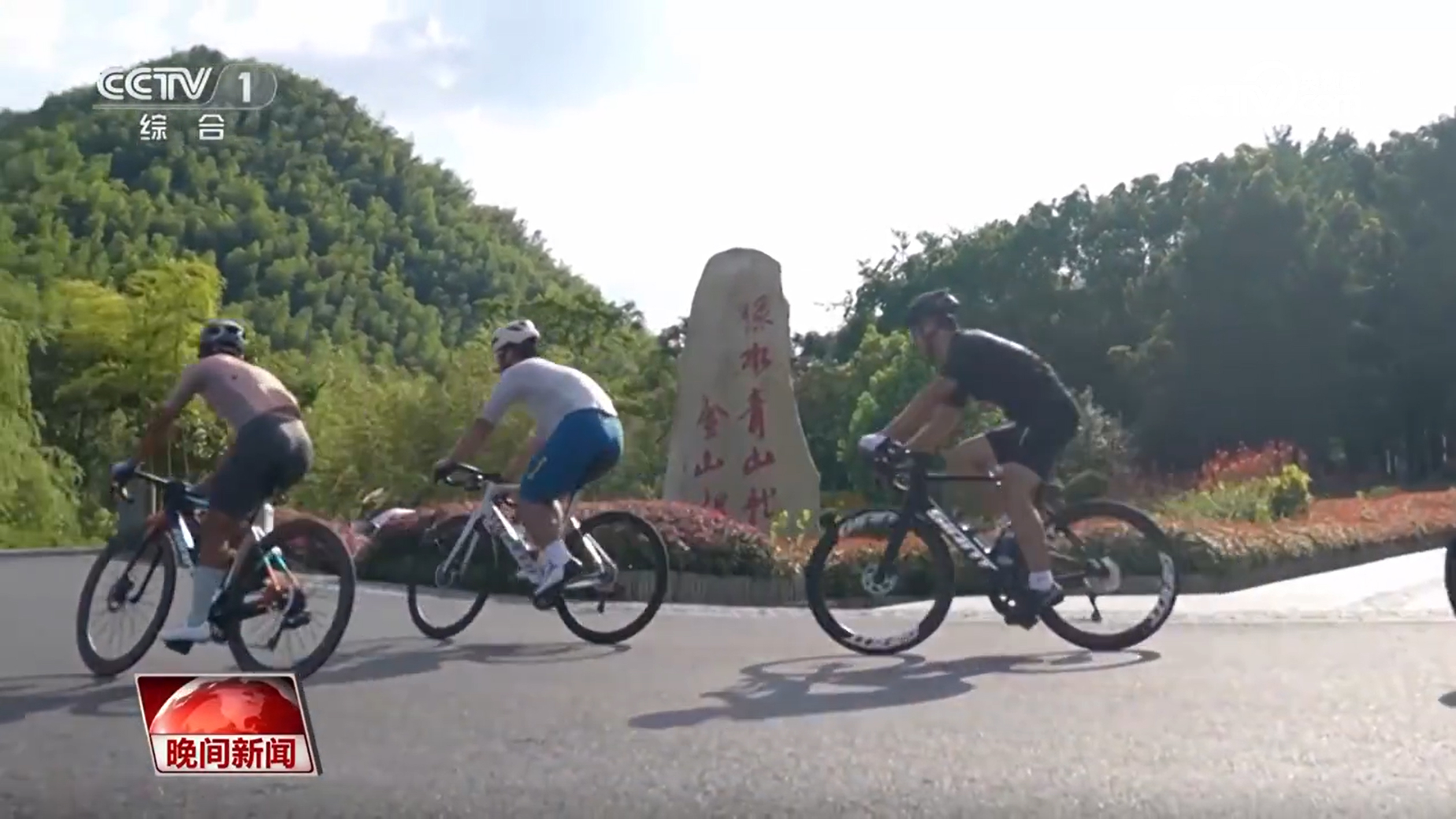 余村乡野骑行俱乐部负责人 徐亮:就像我们背后这块旗子写的,The Mountain Is Calling,大山在召唤。(这里)有高山有峡谷,(可以)体验这种上坡下坡的快乐,环境又这么优美,绿水青山,蓝天白云,还能看到真的是建设得非常非常现代化的乡村。
