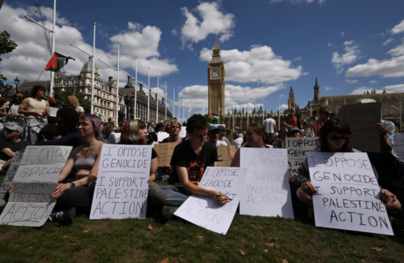 路透社援引现场视频称,有些示威者挥舞巴勒斯坦国旗,高呼“不要干涉加沙”,还举着写有“我反对种族灭绝,我支持‘巴勒斯坦行动’”的标语牌。聚集在伦敦议会广场的示威者随后被警方带走,人群向警察高喊:“你们真可耻。”