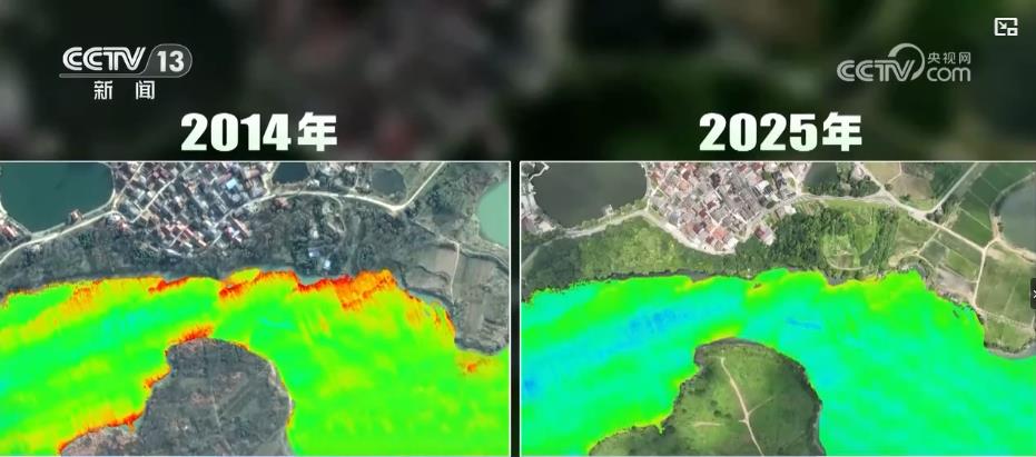 穿城而过的这条溪流,高光谱相机定期监测着水中氨氮等污染物指标的变化。研究人员将监测到的数据还原成这样的影像图,红色代表着水中的污染物。十多年前,溪水沿线遍布红色。而现在,红色消失了,当地整体水质从原来的四类跃升到二类。清澈的溪流中生长出20多个漂流点,一个夏天的旅游收入就超过2亿元。