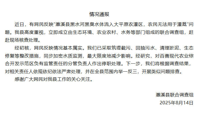 正在阅读:安徽濉溪县通报“黑臭水体流入农灌区”:情况基本属实 相关负责人已停职