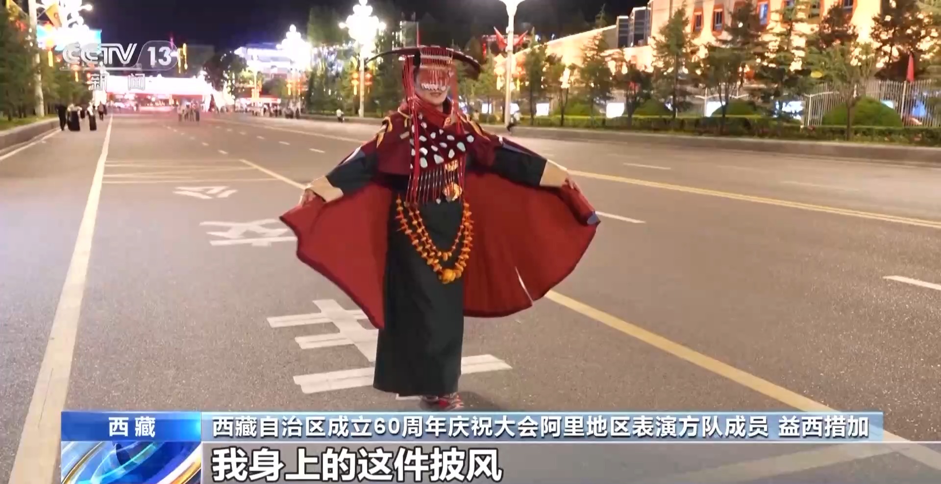 西藏自治区成立60周年庆祝大会阿里地区表演方队成员 益西措加:孔雀服的起源距今有千年历史,创作灵感得益于傲然开屏的孔雀,我身上这件披风首次被挖掘亮相,与平时所穿的孔雀服的披肩是有所不同的,披肩的两个袖子不用于穿戴,而是自然地垂落在身后,尽显高贵典雅气质。