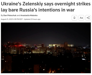 首先,双方条件鸿沟并未因美俄首脑会晤而缩小。阿拉斯加会晤后,美俄均未公布停火框架、三方会面时间表或执行清单,双方通报多以“富有成效”“将继续接触”等原则性表述收尾,特朗普政府也没有拿出可落地的成果。相反,路透社等多方报道显示,俄罗斯的诉求仍是要求乌方在主权与安全架构上做出让步,这对乌克兰来说完全无法接受。由于关键分歧未被缩小,因此,这种僵持在一周内酝酿转化为火力与舆论场的同步加压。