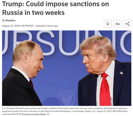 舆论认为,这是特朗普熟悉的“计时器外交”。《华尔街日报》称其为“熟悉的两周期限”:把一段明确的期限公开化,同时把“我给过机会”的叙事摆上台面,以时间倒逼谈判各方,也为后续政策加码预热。阿拉斯加会晤没有产出可执行的停火或三方会面安排,倒计时的设置相当于把责任前置公开——若两周后没有实质动静,升级就更容易获得政治上的正当性。