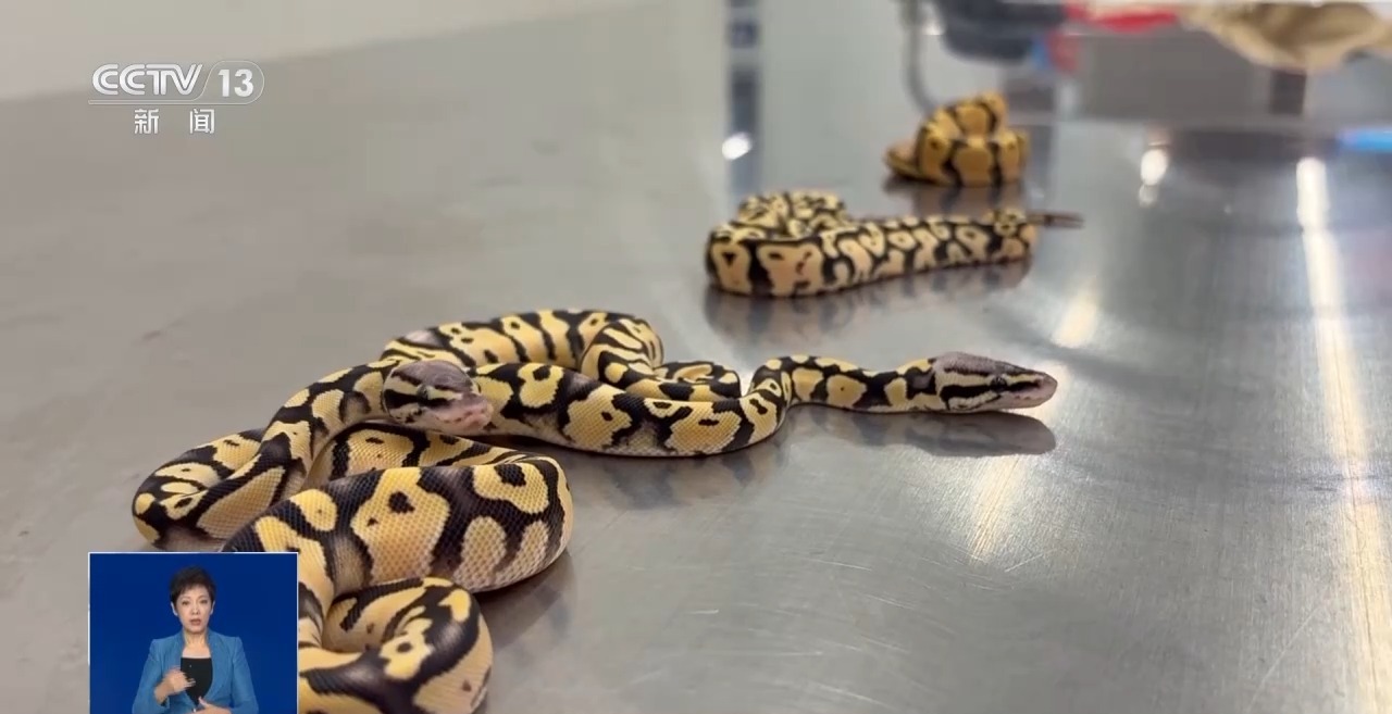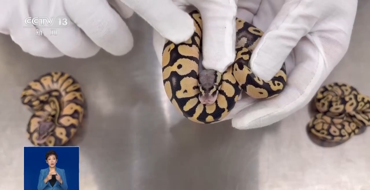 深圳皇岗海关旅检一科一级行政执法员 姚山:这次查获的球蟒,又叫国王蟒、皇蟒,这种蛇类在受惊吓后会以头部为中心盘成圆球状,因此而得名。它们主要分布在中非和西非的雨林,是非洲蟒类中最小的种类。当前球蟒的数量正在逐年下降,已经处于濒临灭绝的状态。