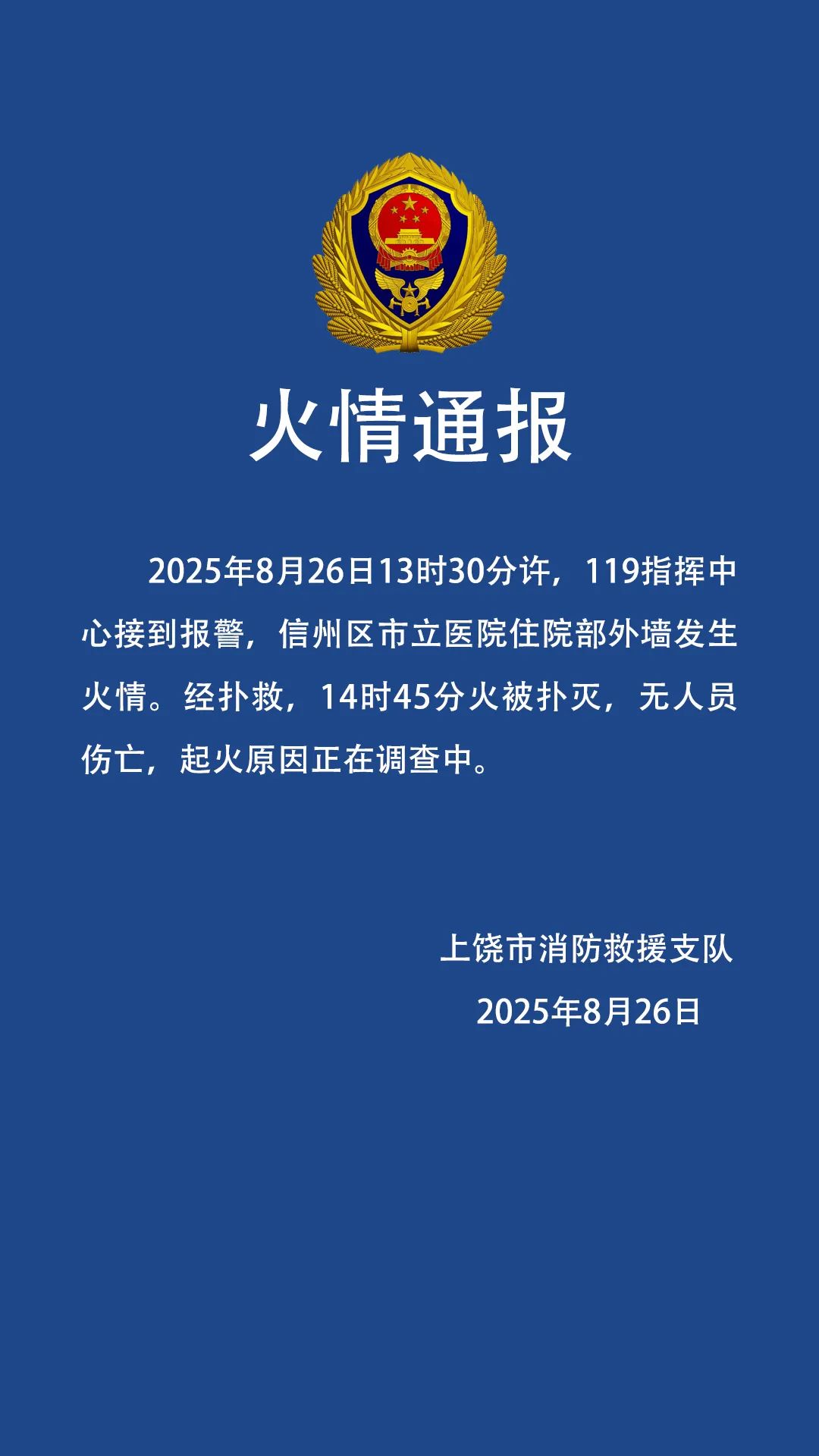 据“上饶消防”公众号消息,8月26日13时30分许,119指挥中心接到报警,江西上饶信州区市立医院住院部外墙发生火情。经扑救,14时45分火被扑灭,无人员伤亡,起火原因正在调查中。