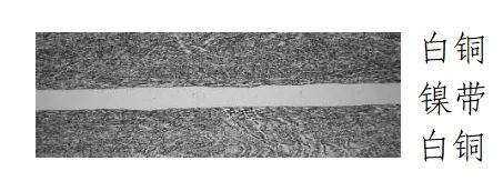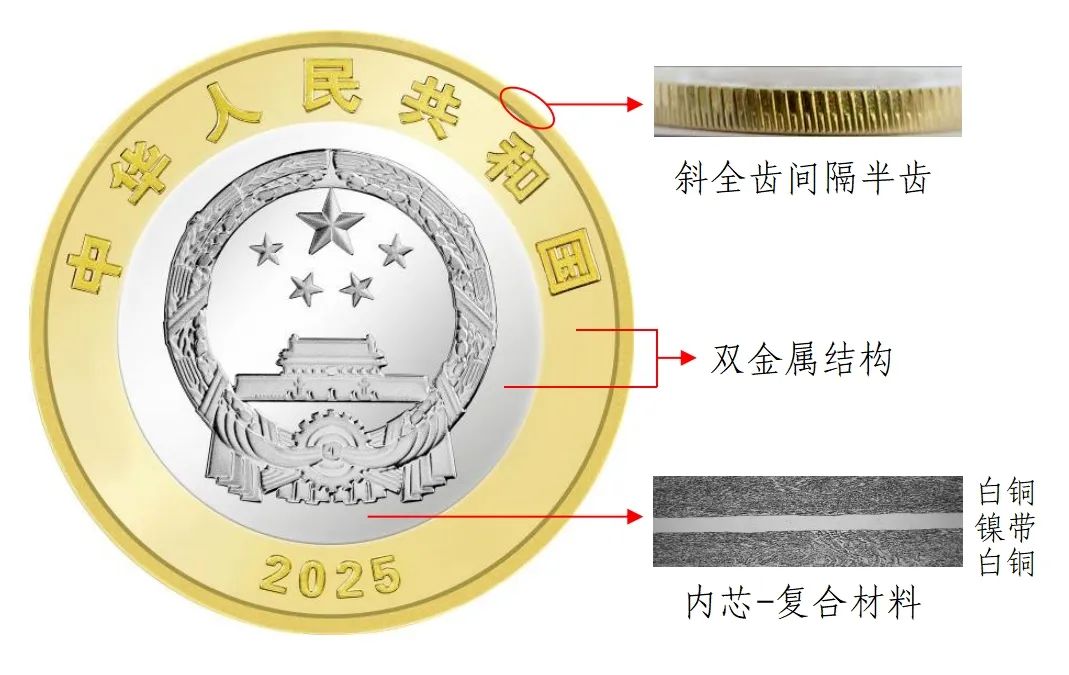 硬币外环为黄铜合金,内芯为具有独特机读性能的镍带复合白铜材料。内芯复合材料防伪特征效果见图1。