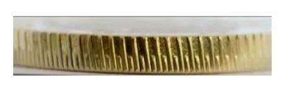 硬币外缘分布有交替排列的斜全齿与半齿。防伪特征效果见图2。