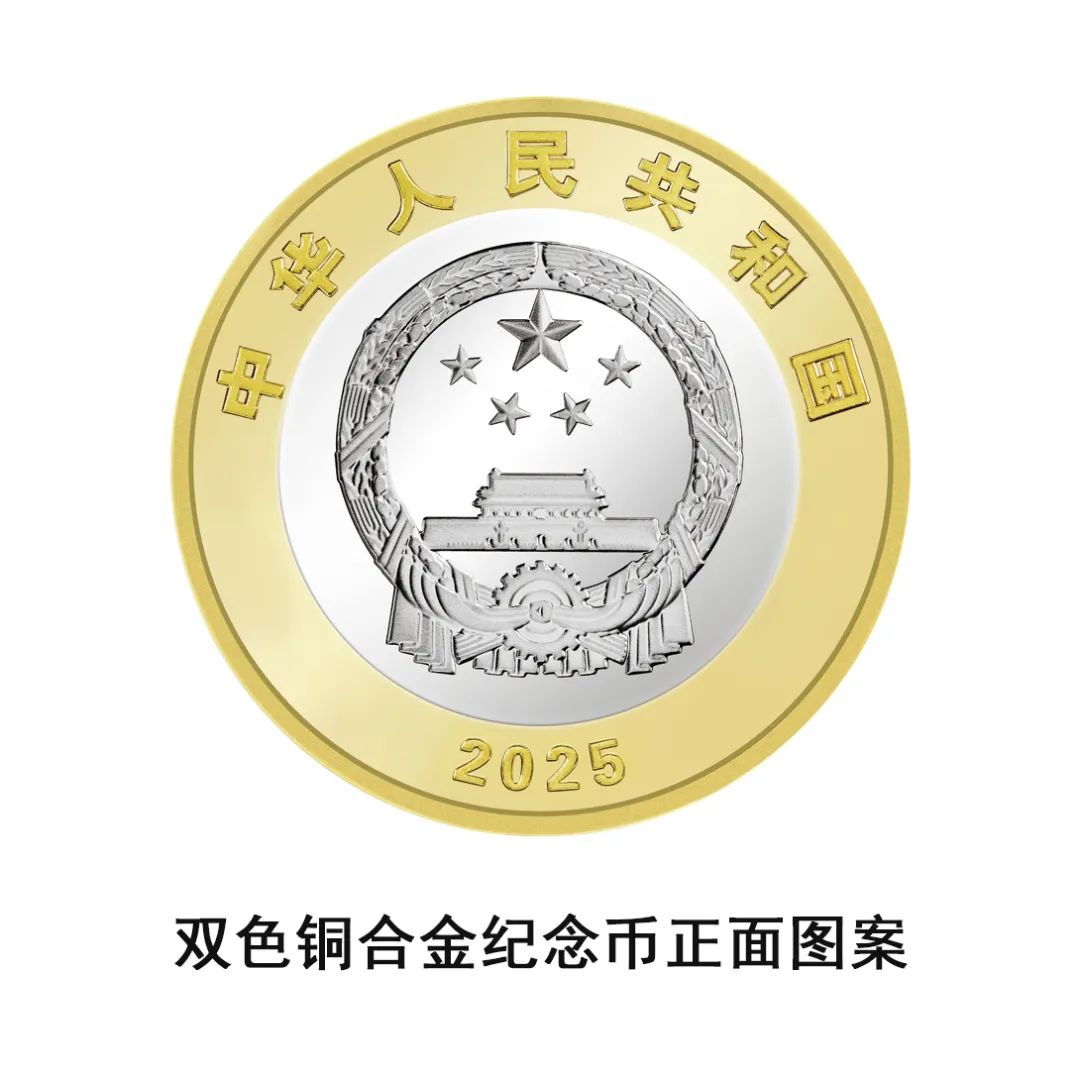中国人民抗日战争暨世界反法西斯战争胜利80周年双色铜合金纪念币正面图案为中华人民共和国国徽,国徽上方刊“中华人民共和国”国名,下方刊年号“2025”字样。