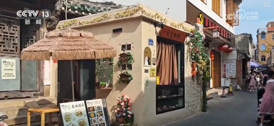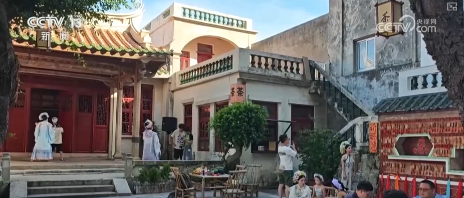 改造后极具闽南韵味的红砖古厝,燕尾屋脊被赋予新功能。多处民居院落改造为文化驿站和便民休憩点。融合闽南传统花砖元素开设咖啡茶座、文创小铺,桌布、杯垫等衍生品也沿用花砖图案设计。原本废弃的图书馆后院也改成公共庭院,供游客休憩。