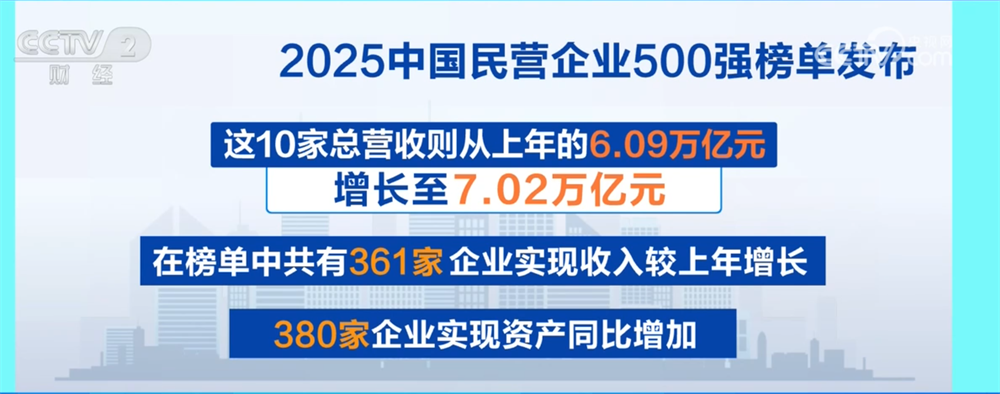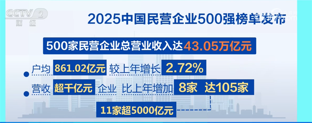 央视网消息:8月28日,全国工商联在辽宁沈阳发布 “2025中国民营企业500强榜单”,榜单由2024年营收前500名的民营企业构成。统计显示,民营企业500强整体规模持续提升,经营效益持续向好。