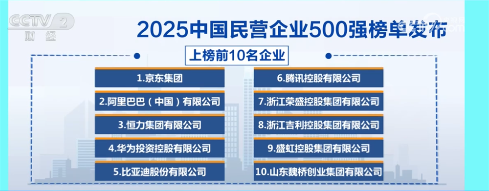 这份2025中国民营企业500强榜单的营收入围门槛为270.23亿元,结果显示,京东集团、阿里巴巴中国有限公司、恒力集团有限公司位居前三,格局保持多年不变。