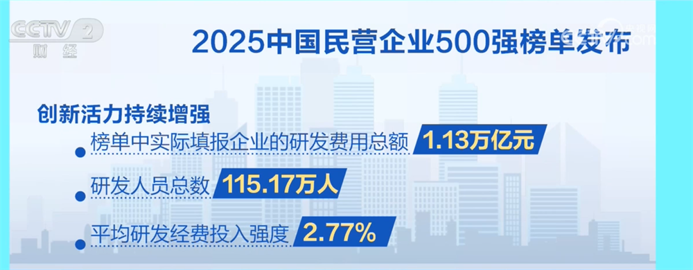 在经营效益方面,民营企业500强实现净利润合计1.80万亿元,同比增长6.48%。此外,创新活力持续增强,榜单中实际填报企业的研发费用总额1.13万亿元,研发人员总数115.17万人,平均研发经费投入强度2.77%。