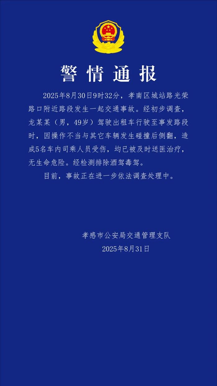 央视网消息:8月31日,湖北孝感市公安局交通管理支队发布警情通报:2025年8月30日9时32分,孝南区城站路光荣路口附近路段发生一起交通事故。经初步调查,龙某某(男,49岁)驾驶出租车行驶至事发路段时,因操作不当与其它车辆发生碰撞后侧翻,造成5名车内司乘人员受伤,均已被及时送医治疗,无生命危险。经检测排除酒驾毒驾。目前,事故正在进一步依法调查处理中。