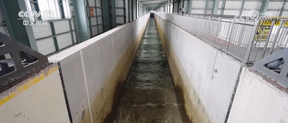这是世界上综合性能领先的大比尺波浪水槽,可以模拟百年一遇的风浪场景。在水槽中正在开展的是阿联酋某港口防波堤抗浪实验,实验人员按照1:5的比例,把实际的防波堤缩小建造出来,用于研究不同海况和水位组合下的防波堤的稳定性。