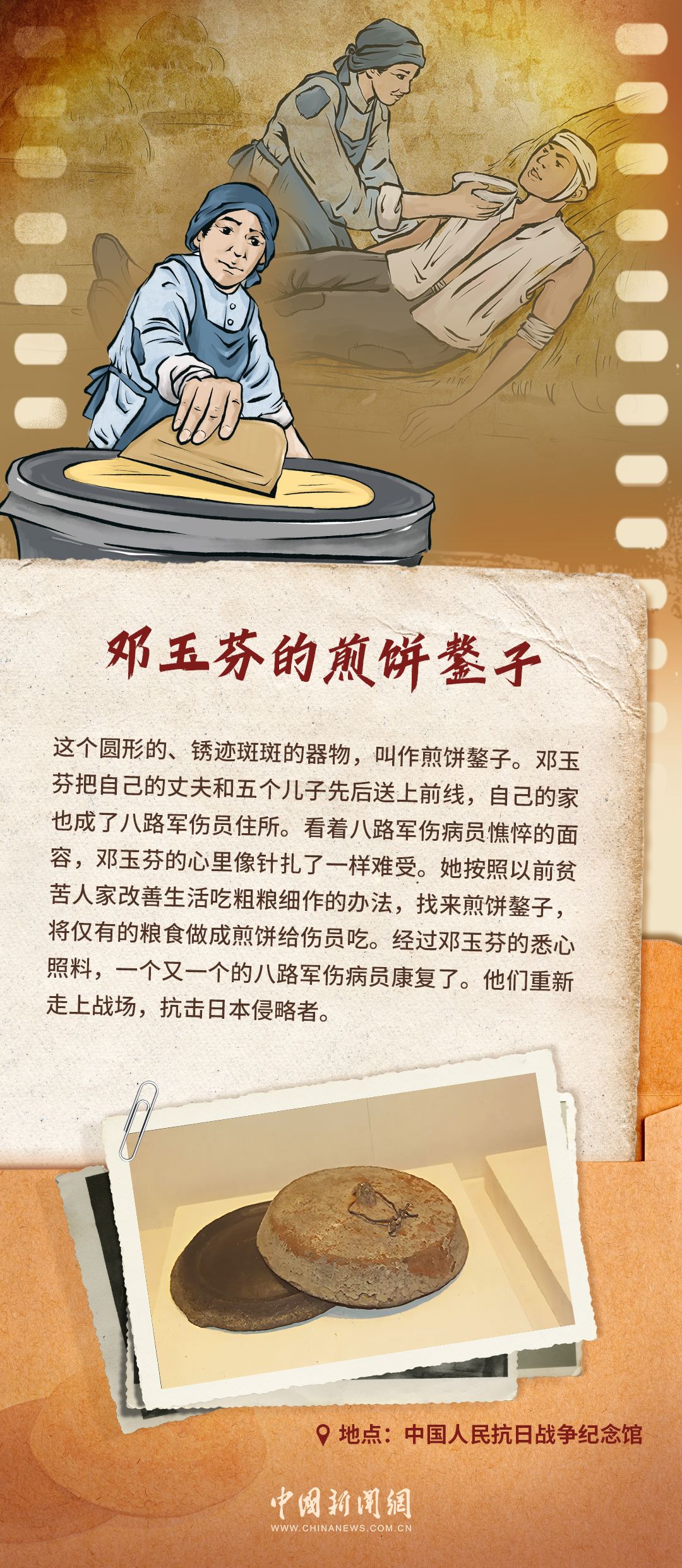 一把小木勺,胡春花用它为伤员一勺勺喂药喂饭;一方煎饼鏊,邓玉芬用它为战士们烙饼充饥;一口行军锅,打了17个补丁仍在使用,铁锅里的每一道裂缝,都记录着军民鱼水情的温暖……这些斑驳的物件,藏着血肉铸就的抗战史诗,诉说着那段艰苦岁月里最动人的温情故事。