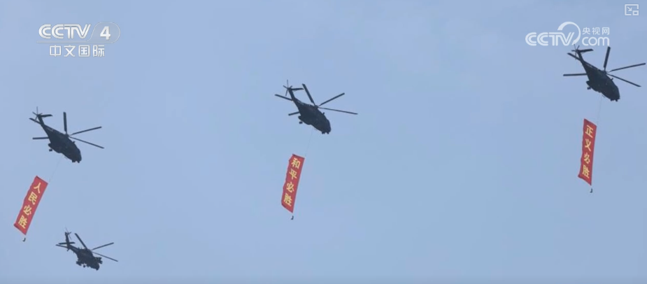 阅兵式展示了中国国产最先进的武器,包括最新一代隐形战斗机、导弹和坦克等,彰显了中国强大的军事实力。评论认为,阅兵式昭告着中国已然成为世界大国,不会被他人孤立,也不惧怕来自外国的压力和欺凌。直升机悬挂旗帜飞过阅兵式上空,写着“正义必胜”“和平必胜”“人民必胜”。中方表示,战争的教训至今仍然具有现实意义,中国将坚定支持历史正确和人类进步,走和平发展道路,同世界各国携手构建人类命运共同体。