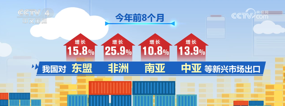 从出口来看,已连续6个月保持增长。2025年前8个月,我国出口17.61万亿元,增长6.9%。其中,我国对东盟、非洲、南亚、中亚等新兴市场出口分别增长15.8%、25.9%、10.8%、13.9%。