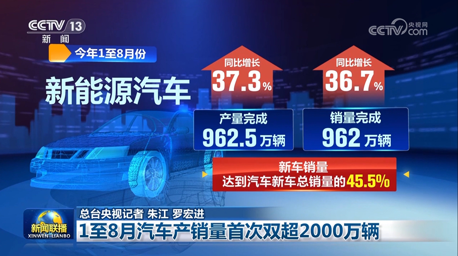央视网消息(新闻联播):记者9月11日从中国汽车工业协会获悉,今年1—8月份,随着“两新”政策持续发力,个人消费贷款财政贴息等政策的及时出台,企业新车型投放热情较高,汽车行业总体运行平稳。最新数据显示,今年1—8月份,汽车产销量首次双超2000万辆。其中,新能源汽车产销量分别完成962.5万辆和962万辆,同比分别增长37.3%和36.7%,新能源汽车新车销量达到汽车新车总销量的45.5%。在出口方面,1—8月份,汽车出口429.2万辆。其中,新能源汽车出口153.2万辆,同比增长87.3%。