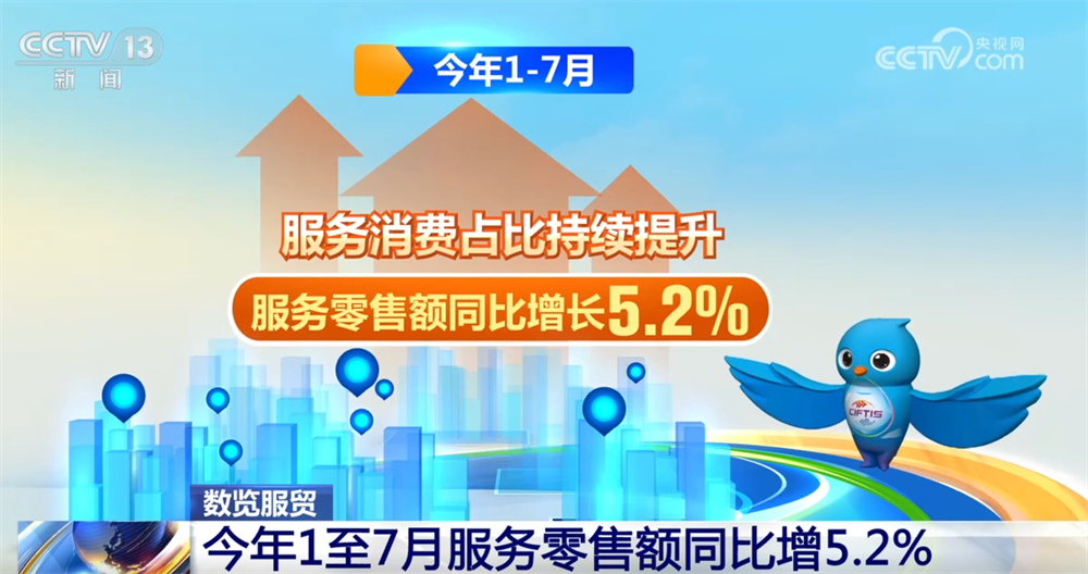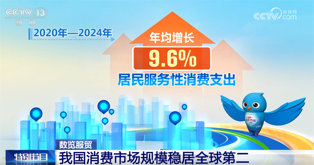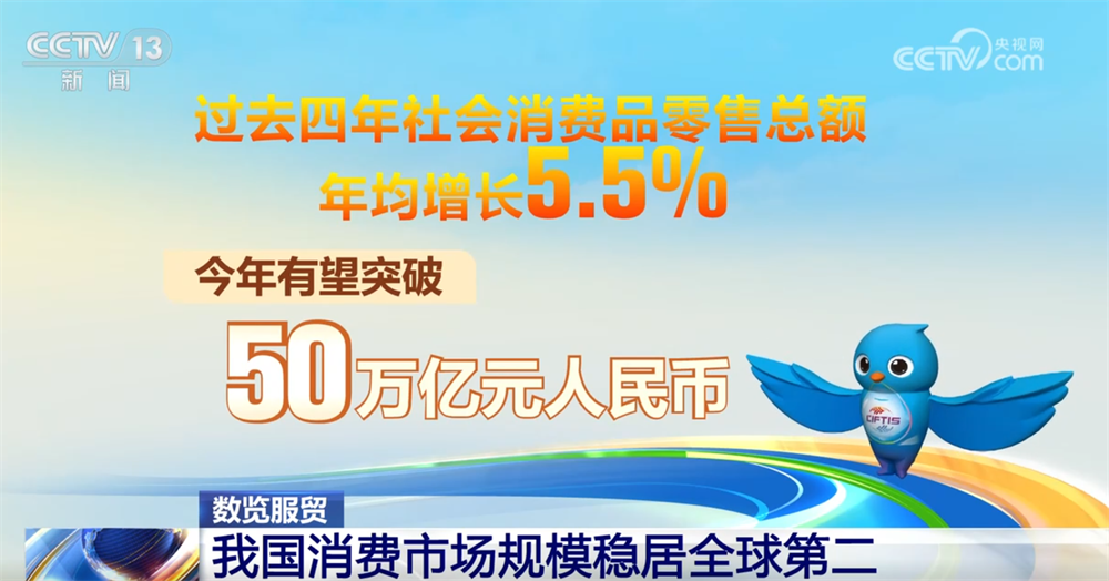 “十四五”期间,我国消费市场规模稳居全球第二,过去四年社会消费品零售总额年均增长5.5%,今年有望突破50万亿元人民币。这其中,服务消费比商品消费增长势头更快,成为扩大消费的重要动力。2020至2024年,居民服务性消费支出年均增长9.6%,现在老百姓每花10块钱,就有4.6元用在了服务消费上。今年1至7月,服务零售额同比增长5.2%,服务消费占比持续提升。