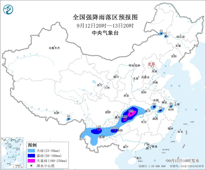 预计,9月12日20时至13日20时,湖北东部和南部、湖南北部、重庆中南部、贵州中北部和西部、四川南部、云南中北部、安徽中南部、江西北部、浙江北部、内蒙古东部等地部分地区有大到暴雨,其中,湖南西北部、湖北西南部、贵州西部和东北部、四川南部、云南北部等地局部地区有大暴雨(100~180毫米)。上述部分地区伴有短时强降水(最大小时降雨量20~50毫米,局地可超过60毫米),局地有雷暴大风等强对流天气。