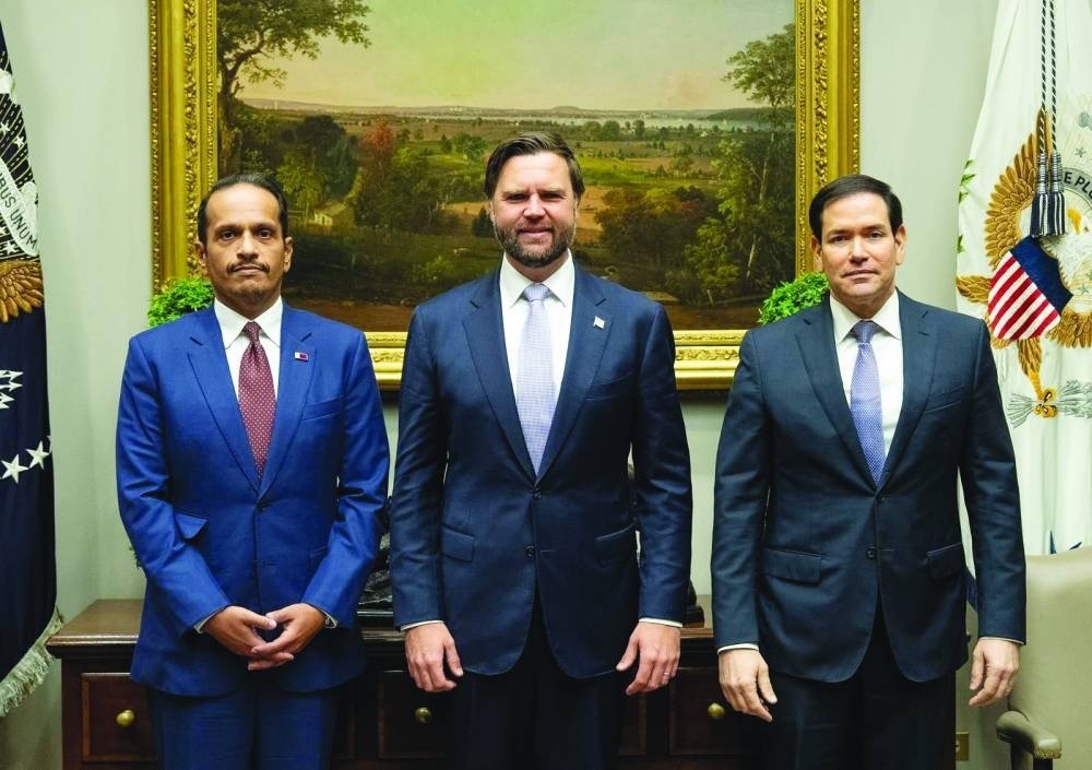 △卡塔尔首相穆罕默德(左)、美副总统万斯(中)与美国务卿鲁比奥(右)