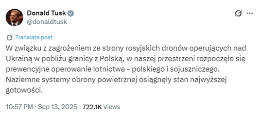 △13日,波兰总理图斯克在社交平台X上发帖称,波兰及其盟友已在本国领空展开“预防性”空中行动。