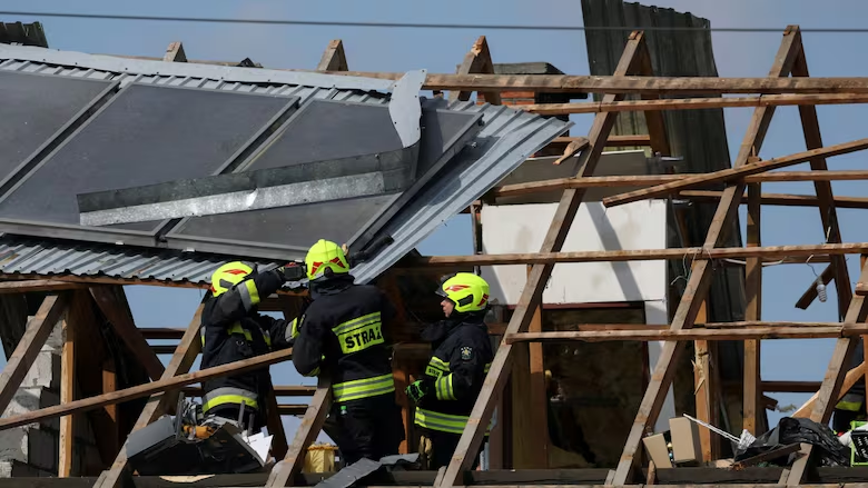 △波兰卢布林地区,消防员聚集在一座被无人机损毁的房屋屋顶上进行检查。