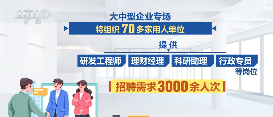 大中型企业专场将组织70多家用人单位,提供研发工程师、理财经理、科研助理、行政专员等岗位,招聘需求3000余人次。