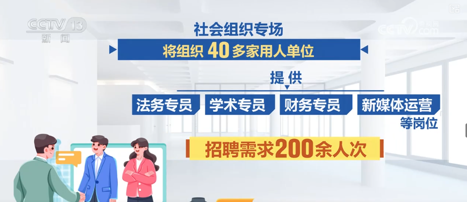 社会组织专场将组织40多家用人单位,提供法务专员、学术专员、财务专员、新媒体运营等岗位,招聘需求200余人次。