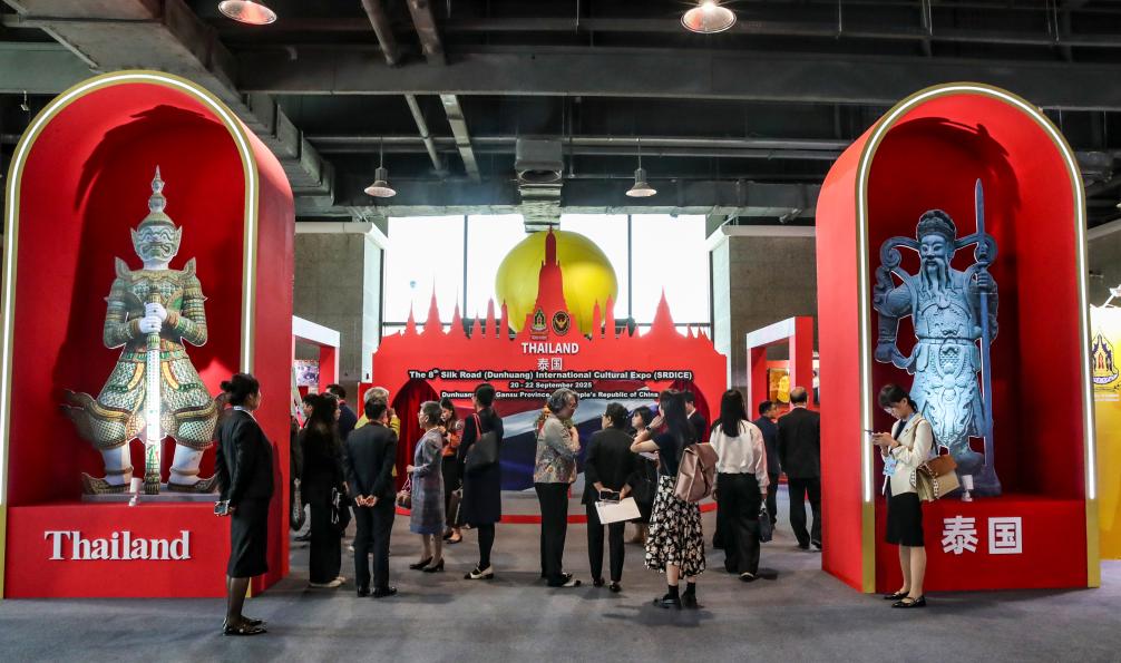 9月21日,在第八届丝绸之路(敦煌)国际文化博览会上,与会嘉宾参观主宾国泰国展厅。新华社记者郎兵兵摄