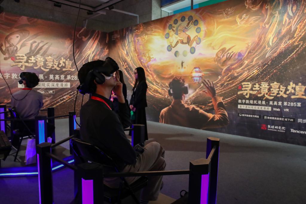 9月21日,在第八届丝绸之路(敦煌)国际文化博览会上,与会嘉宾借助VR设备沉浸式游览莫高窟虚拟场景。新华社记者郎兵兵摄