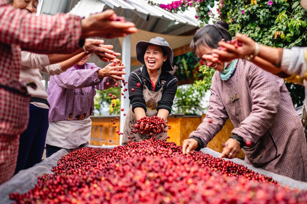 2025年1月8日,在云南普洱思茅区一咖啡庄园,工作人员庆祝咖啡丰收。