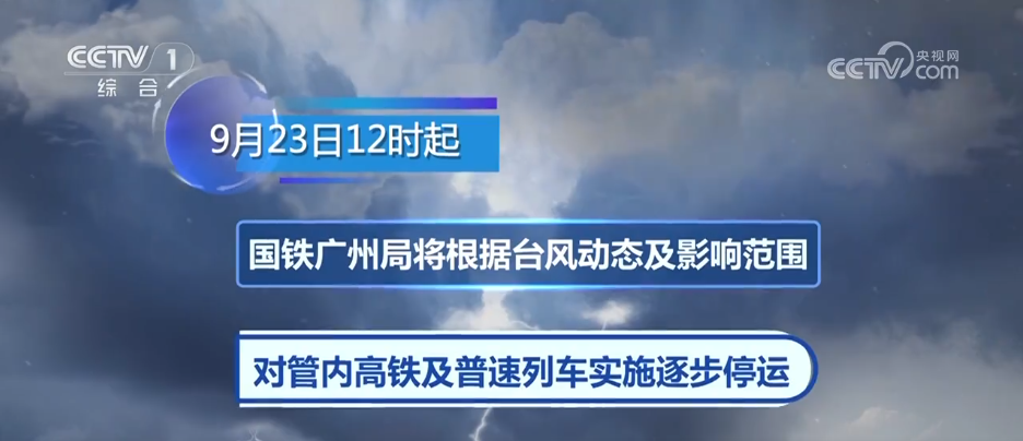 9月23日12时起,国铁广州局将根据台风动态及影响范围,对管内高铁及普速列车实施逐步停运。9月24日全天,广东省内所有高铁、普速列车停运;9月25日凌晨起,将根据台风影响减弱情况进行研判,逐步恢复列车开行。旅客可通过12306网站、App查询最新列车开行信息。