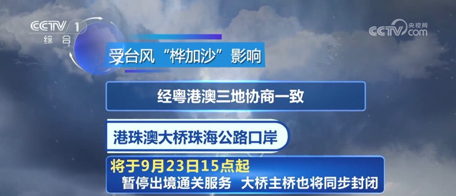 受台风“桦加沙”影响,经粤港澳三地协商一致,港珠澳大桥珠海公路口岸将于9月23日15时起,暂停出境通关服务,大桥主桥也将同步封闭。解封时间将根据台风情况另行公告,提醒司机、旅客留意天气信息和有关交通提示,及时调整出行计划。