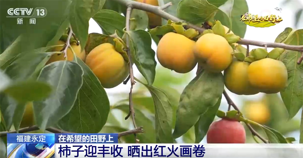 土楼晒秋都晒些什么呢?大家来看,在晒架上,有辣椒、陈皮、花生、红枣等。在这个竹匾里,还晒着一个个颜色鲜艳的柿子。龙岩市的永定区被称为“中国华东柿子之乡”,这里种植了六万多亩的柿子,年产量达5.8万吨。这段时间,漫山遍野的柿子开始进入成熟期,橙红色的果实就像一盏盏小灯笼缀满枝头。客家人会把一部分柿子放在竹匾里,晒上一到两周,制作成柿饼,一口下去,软糯香甜。