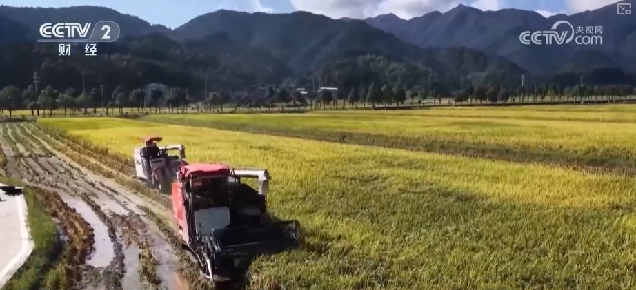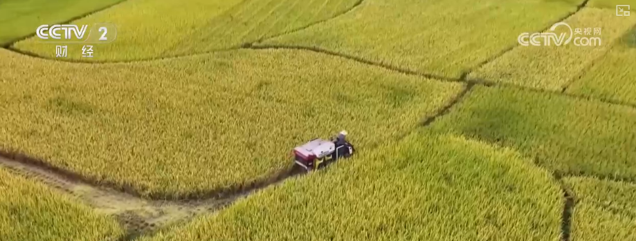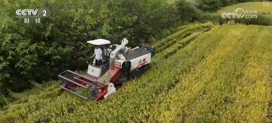 在河南南阳市桐柏县城郊乡彭沟村,沉甸甸的稻穗挂满稻秆,联合收割机在田里忙碌穿梭。