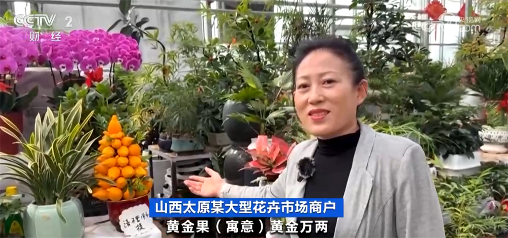 山西太原某大型花卉市场商户称:“像这个挺特别的,黄金果,走得也挺好,黄金果寓意黄金万两,颜色也好看;像那些小的盆景,有招财树,像这个绿如意也叫绿翡翠,它这个寓意也好,事事如意。”