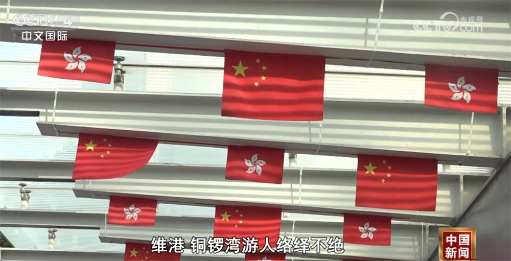 在香港的街头巷尾,五星红旗与紫荆花区旗迎风飘扬,祝福标语和庆祝海报处处可见,节日气氛浓郁。