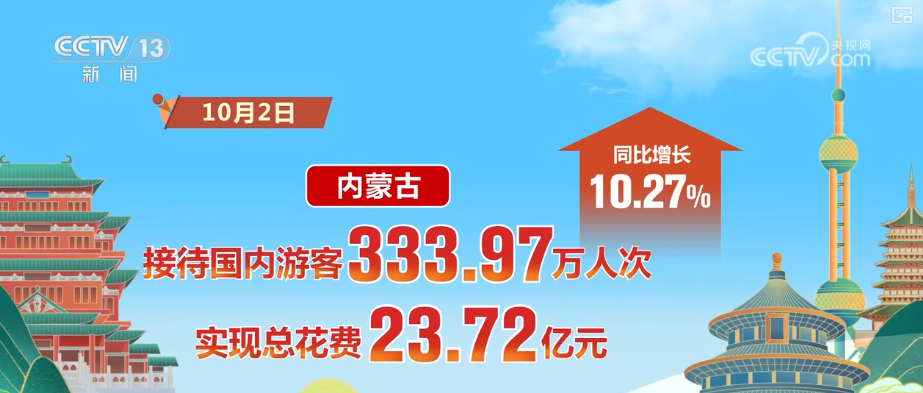 记者从内蒙古自治区文化和旅游厅了解到,假期第二天,内蒙古接待国内游客333.97万人次,同比增长10.27%,实现总花费23.72亿元。