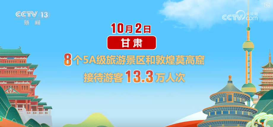 甘肃全省累计接待游客406万人次,实现旅游花费25.1亿元,分别较上年同期增长5.2%和5.5%。全省8个5A级旅游景区和敦煌莫高窟人数持续攀升,接待游客达到13.3万人次。